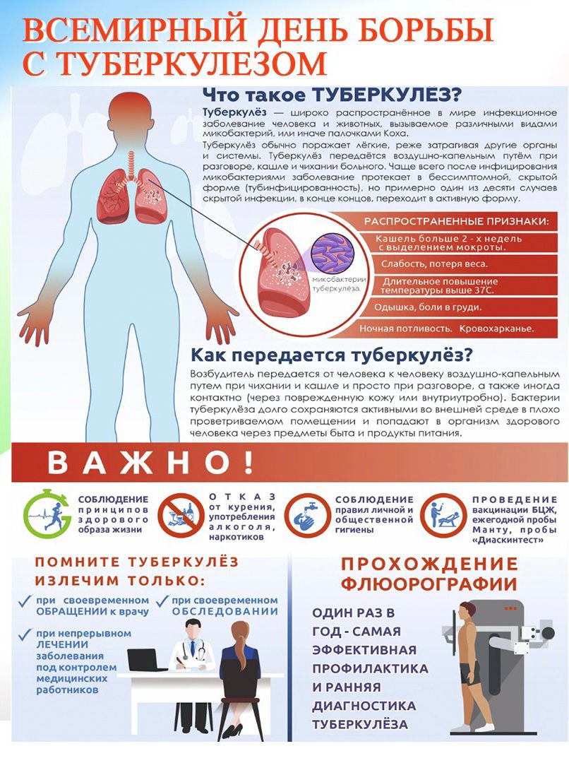 Ежегодно по инициативе Всемирной организации здравоохранения 24 марта отмечается Всемирный день борьбы с туберкулезом, призванный повысить осведомленность общественности о губительных последствиях туберкулеза для здоровья и общества и активизировать усилия по борьбе с этим инфекционным заболеванием. В этот день, в 1882 году Роберт Кох объявил о том, что ему удалось открыть бактерию, вызывающую туберкулез, благодаря чему стала возможна разработка методов диагностики и лечения этого заболевания.